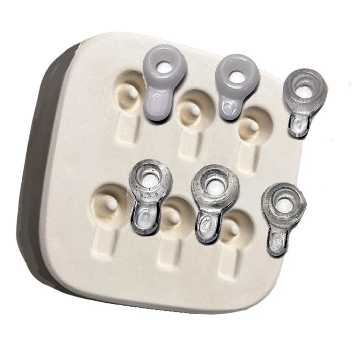 This mold produces glass bails that can be fired or glued onto glass designs to create ornaments and jewelry.
