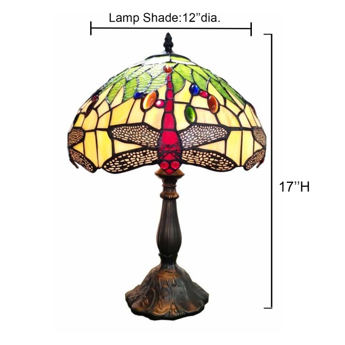 Hand made in the true tiffany method - foiled and soldered. The shade contains a stunning Dragonfly design with natural colors. All sitting on a classic Lily base. A perfect addition to a Living Room, Bedroom, Office, and more!